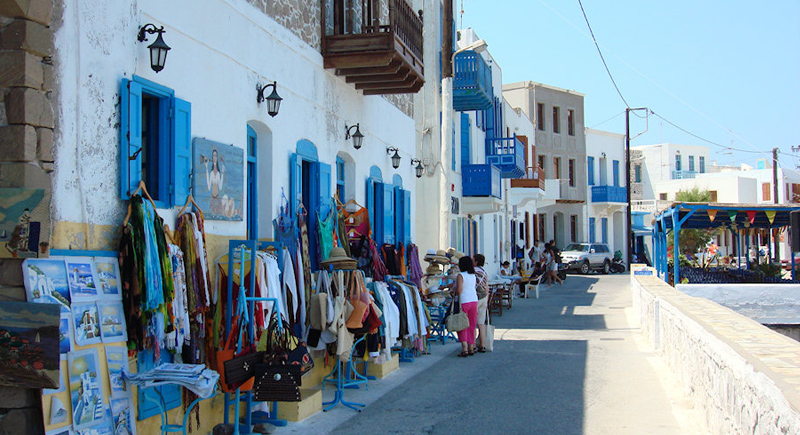 Pemandangan rumah bertingkat bercat batu putih, bar, dan toko-toko di pulau Yunani indah dari Nisyros, di mana kota Mandraki menawarkan pemandangan biru laut nun cantik. Tempat ini hanya berjarak pendek dari Palekastro ...